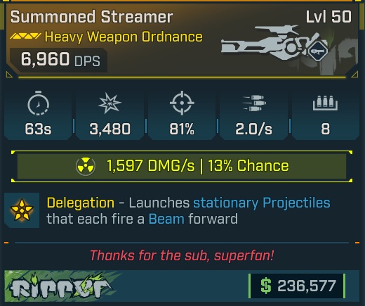 ⭐L50 STREAMER - 6.960 DPS (+1.597 RAD DMG/s) - 63s CD - 81% ACCURACY - 2.0/s FIRE RATE - 8 MAG SIZE⭐