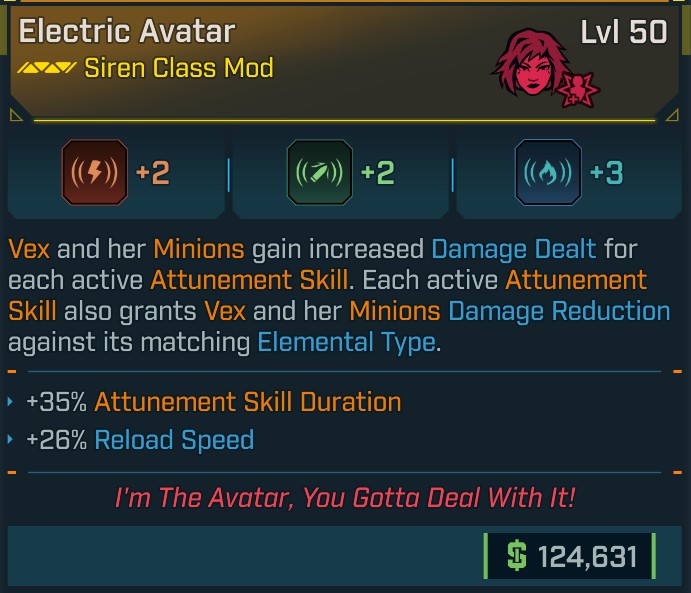 ⭐L50 AVATAR +2 SHOCKING ATTUNE, +2 LEECHING ATTUNE, +3 BURNING ATTUNE, -35% ATTUNE DURATION, -26% RE