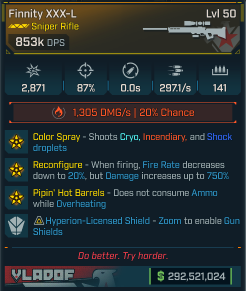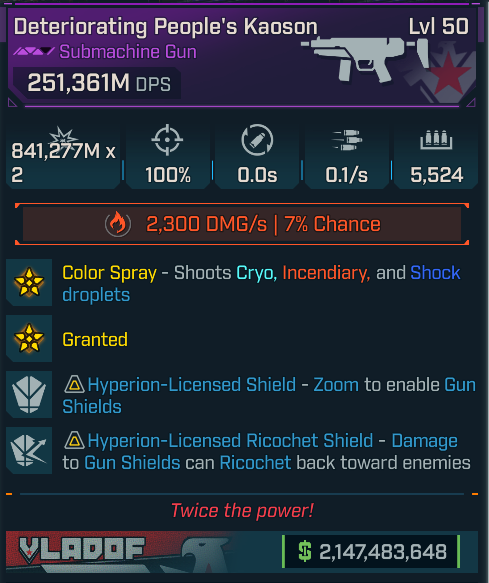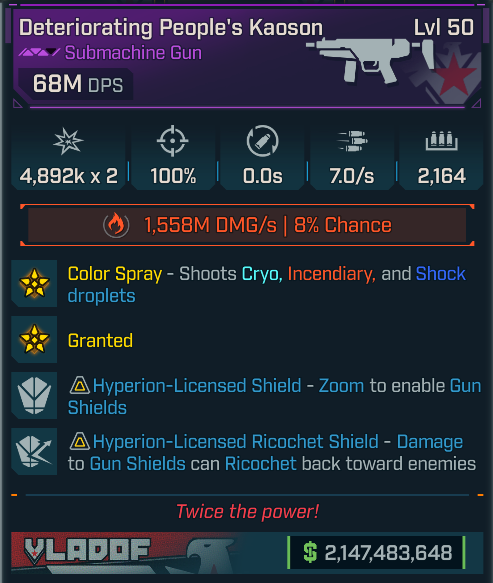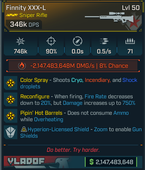 ◉ People’s Kaoson (SMG, fast) — Laser-accurate hose, huge mag, Gun Shield + ricochets, multi-element DoT; melts bosses and mobs. ◉ People’s Kaoson (SMG, heavy-hit) — Gigantic per-shot damage with 100% accuracy, Gun Shield + ricochets; deletes tanky targets. ◉ Finnity XXX-L (Sniper, ramp) — +750% damage ramp (Reconfigure) + free shots while overheated; easy one-shots with Gun Shield. ◉ Finnity XXX-L (Sniper, bugged DoT) — Same ramp + free shots, plus broken DoT numbers for instant boss nukes. ◉ San Saba “Songbird” (Pistol) — +100% damage after weapon swap, homing orbs on reload, explosive gyrojets; burst eraser. ◉ Panicking Hellwalker (Shotgun) — 10-pellet multi-element nuke; stupidly high burst for room wipes. ◉ Tossed Panicking Hellwalker (Shotgun) — Same multi-element Hellwalker power; rapid burst deletes elites at close range. ◉ Screeching Hellwalker (Shotgun) — Hellwalker with insane fire rate; absolute blender for point-blank clears. ◉ Put Terrifying First Impression (Shotgun) — Auto-crit scaling by enemy HP, ammo-absorbing Gun Shield + ricochets, explosive gyrojets; monstrous openers.
