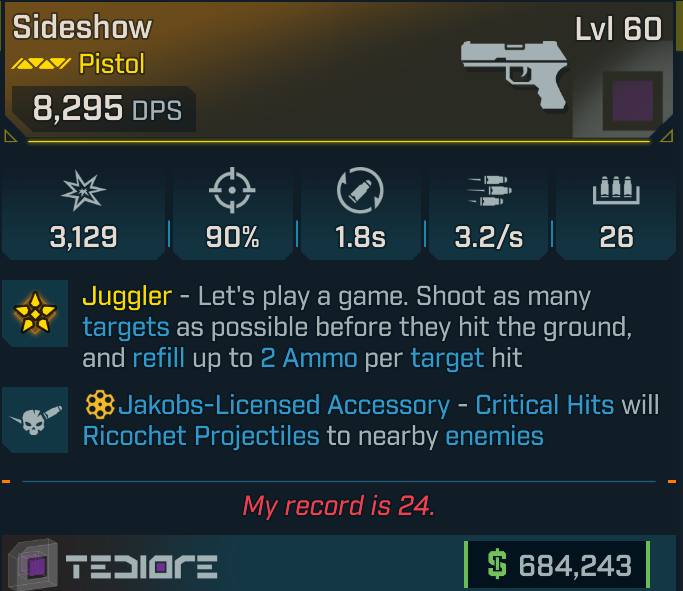 [GODROLL] Sideshow [Jakobs crit] (Tediore pistol)