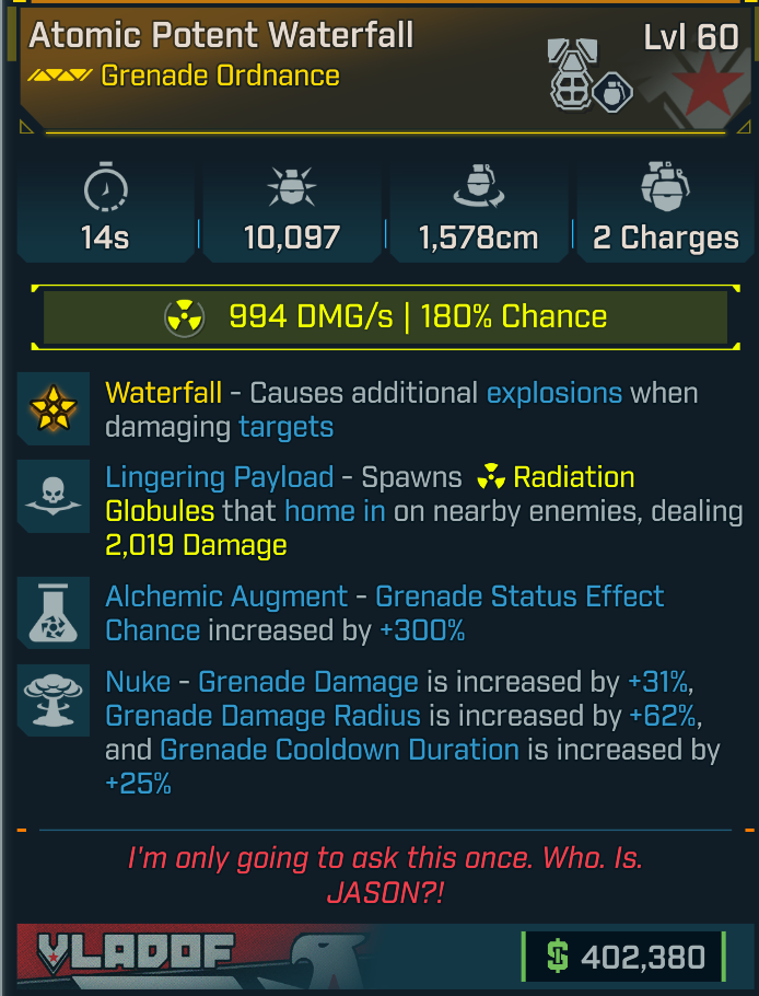 [GODROLL] Waterfall [radiation] [Lingering + Alchemic, Nuke] (Vladof grenade)