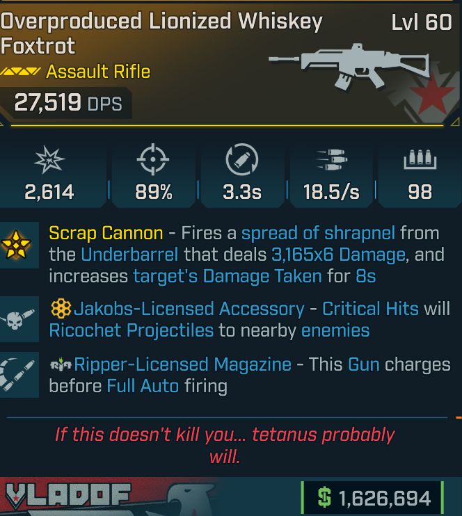 [GODROLL] Whiskey Foxtrot [Scrap Cannon] [Ripper auto, Jakobs crit] (Vladof assault)
