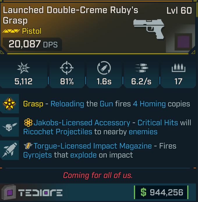 [GODROLL] Ruby's Grasp [Jakobs crit, Torgue impact] (Tediore pistol)
