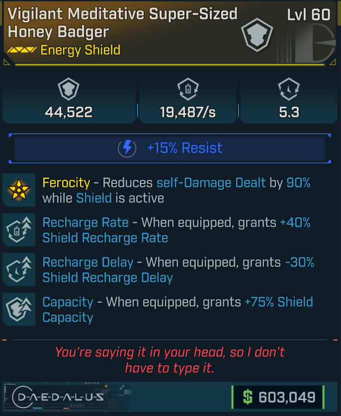 [GODROLL] Honey Badger [Recharge delay, Recharge rate, Capacity] (Daedalus shield)