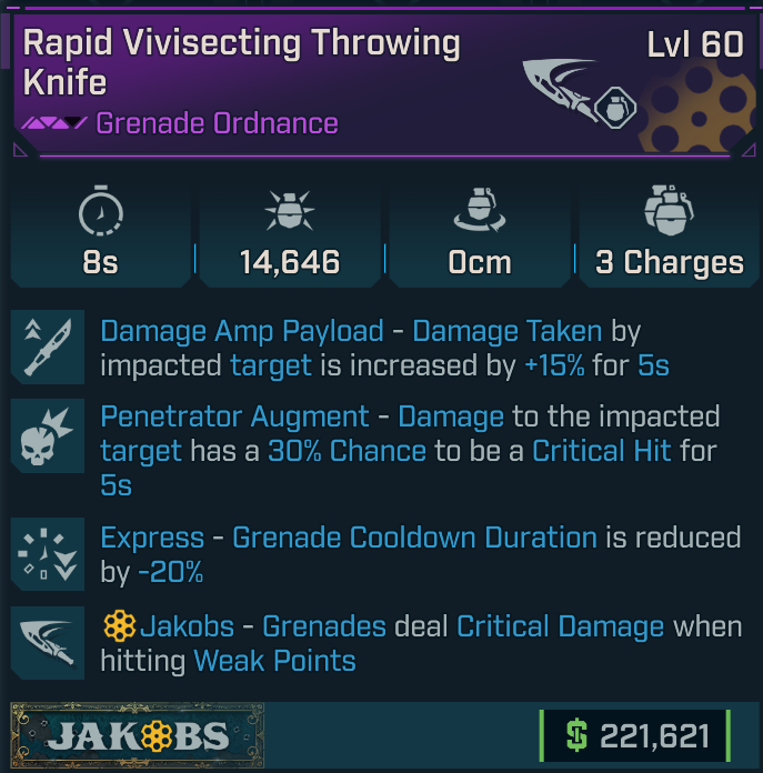 [GODROLL] Vivisecting Throwing Knife [Amp + Penetrator] (crit knife) (Jakobs grenade)