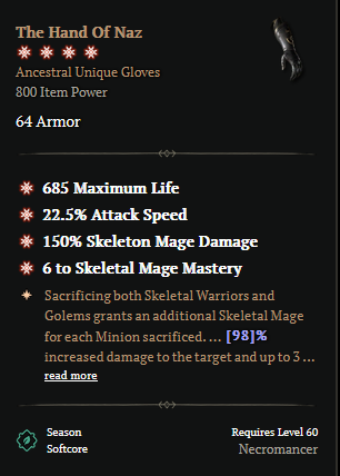 SEASON 10 4 GA THE HAND OF NAZ UNIQUE MINION NECROMANCER GLOVE 4GA THE HAND OF NAZ NECROMANCER GLOVE
