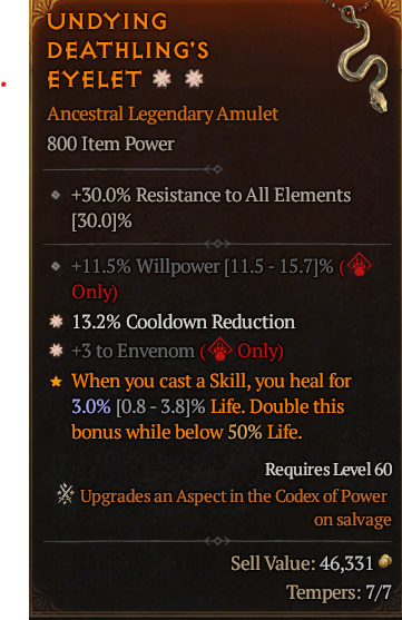 SEASON 10 2 GA DRUID AMULET GA +3 ENVENOM GA 13.2% COOLDOWN REDUCTION %11.5 WILLPOWER 2GA DRUID AMU