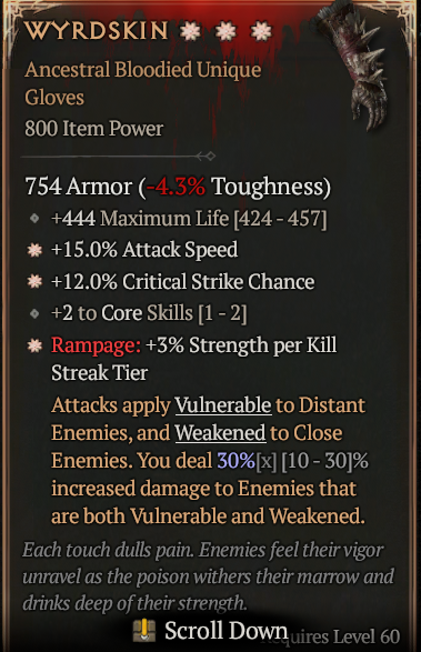 3GA Wyrdskin (Max Aspect) • Bloodied: 3% Strength Per Kill • Critical Strike Chance • Attack Speed /