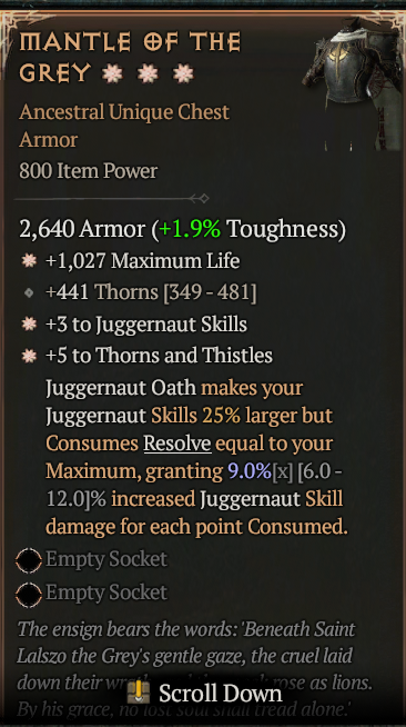 3GA Mantle of the Grey (9/12) GA +5 Thorns and Thistles / GA +3 Juggernaut Skills / GA Maximum Life