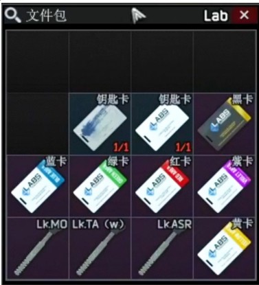 Document box + red + blue + green + purple + black + yellow key card + 3 lab keys + 2 key cards marked with blue