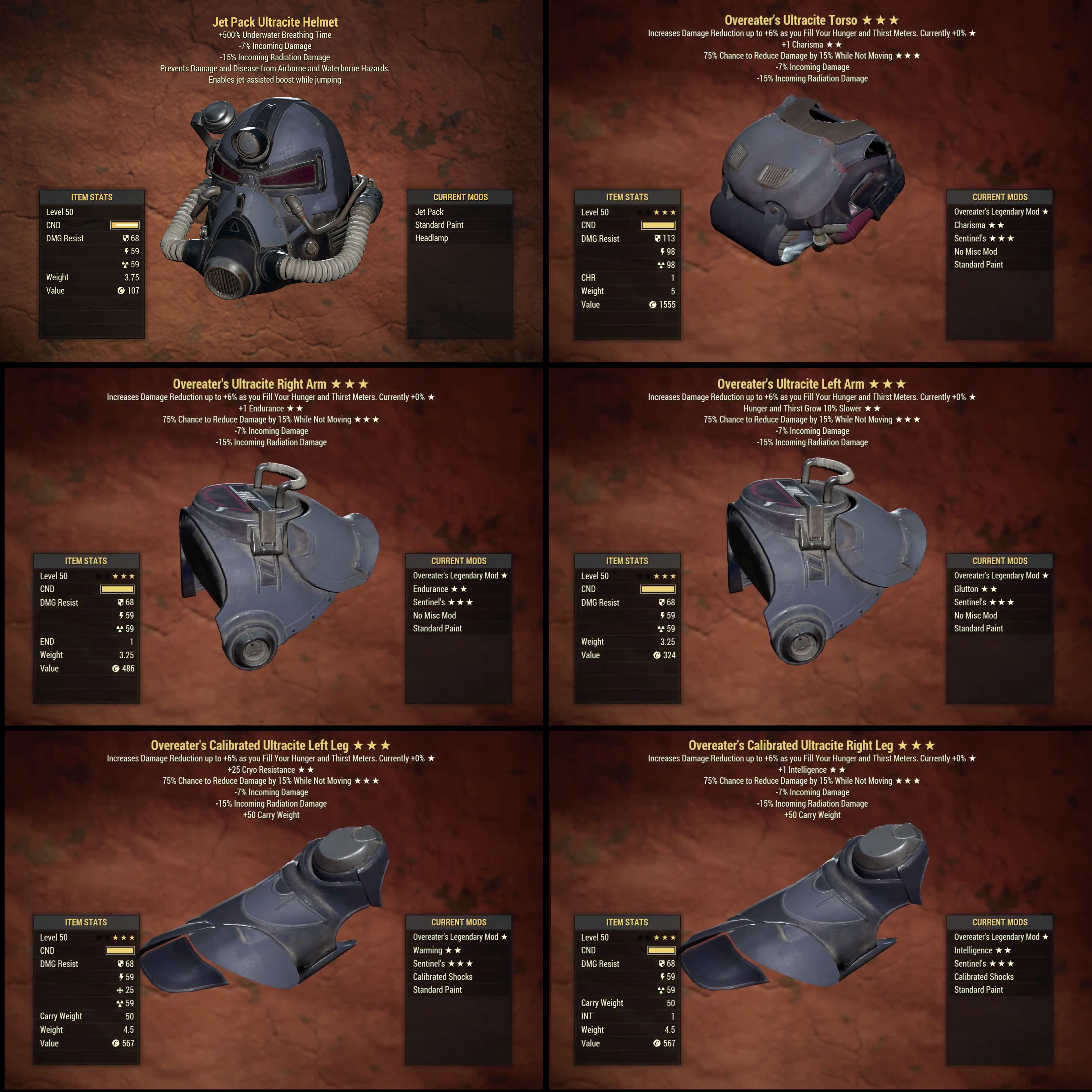 This listing includes a full set of legendary Ultracite Power Armor (max level), with each piece of armor having the following effect:
