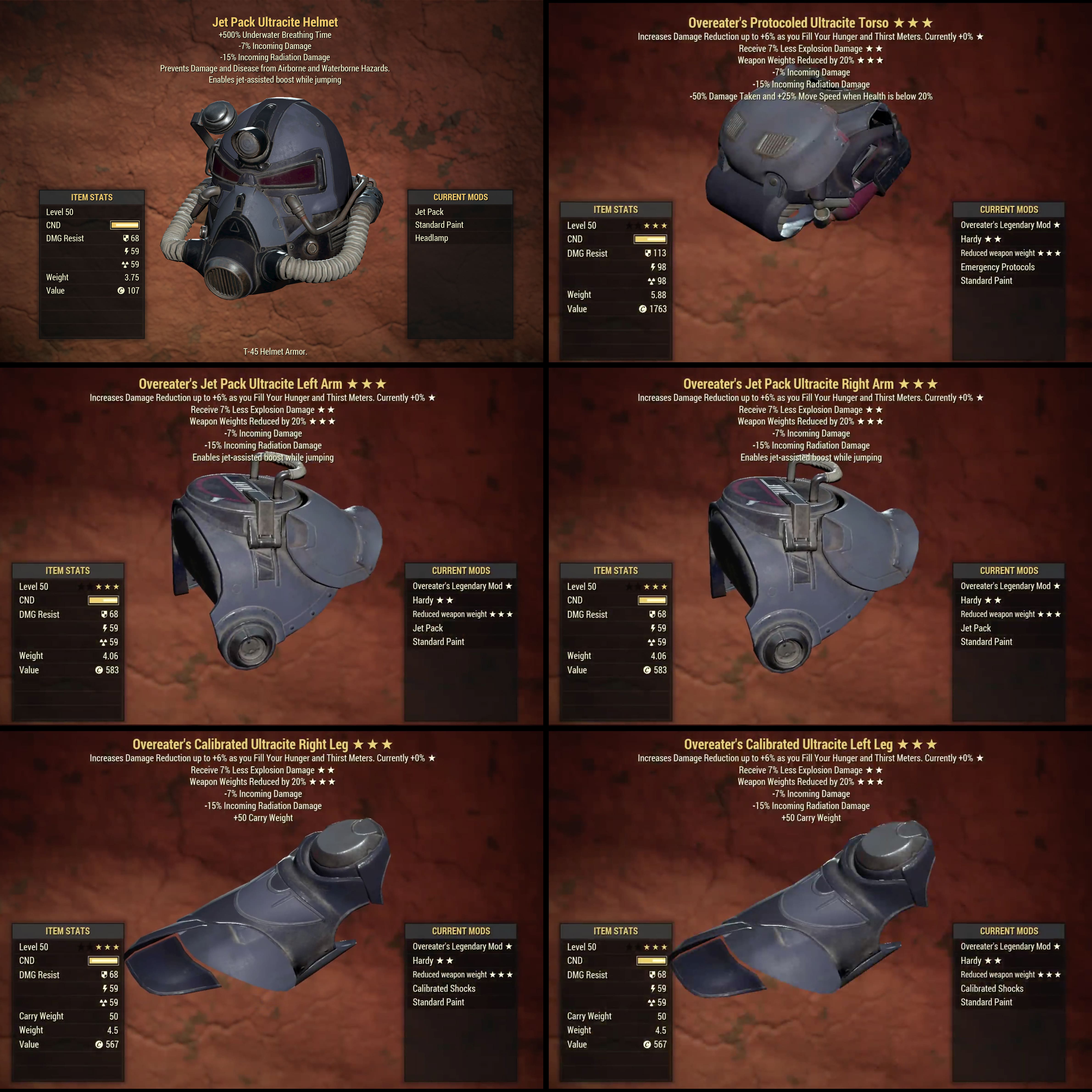 This listing includes a full set of legendary Ultracite Power Armor (max level), with each piece of armor having the following effect: