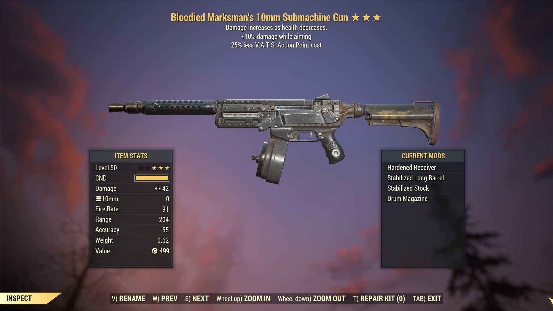 Bloodied 10mm Submachine Gun (+25% damage WA, 25% less VATS AP cost)