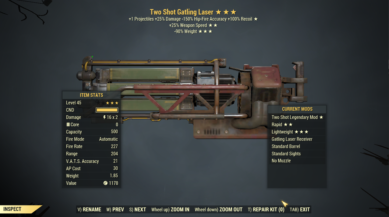 Two shot 25% Faster Fire Rate 90% Reduced Weight Gatling Laser