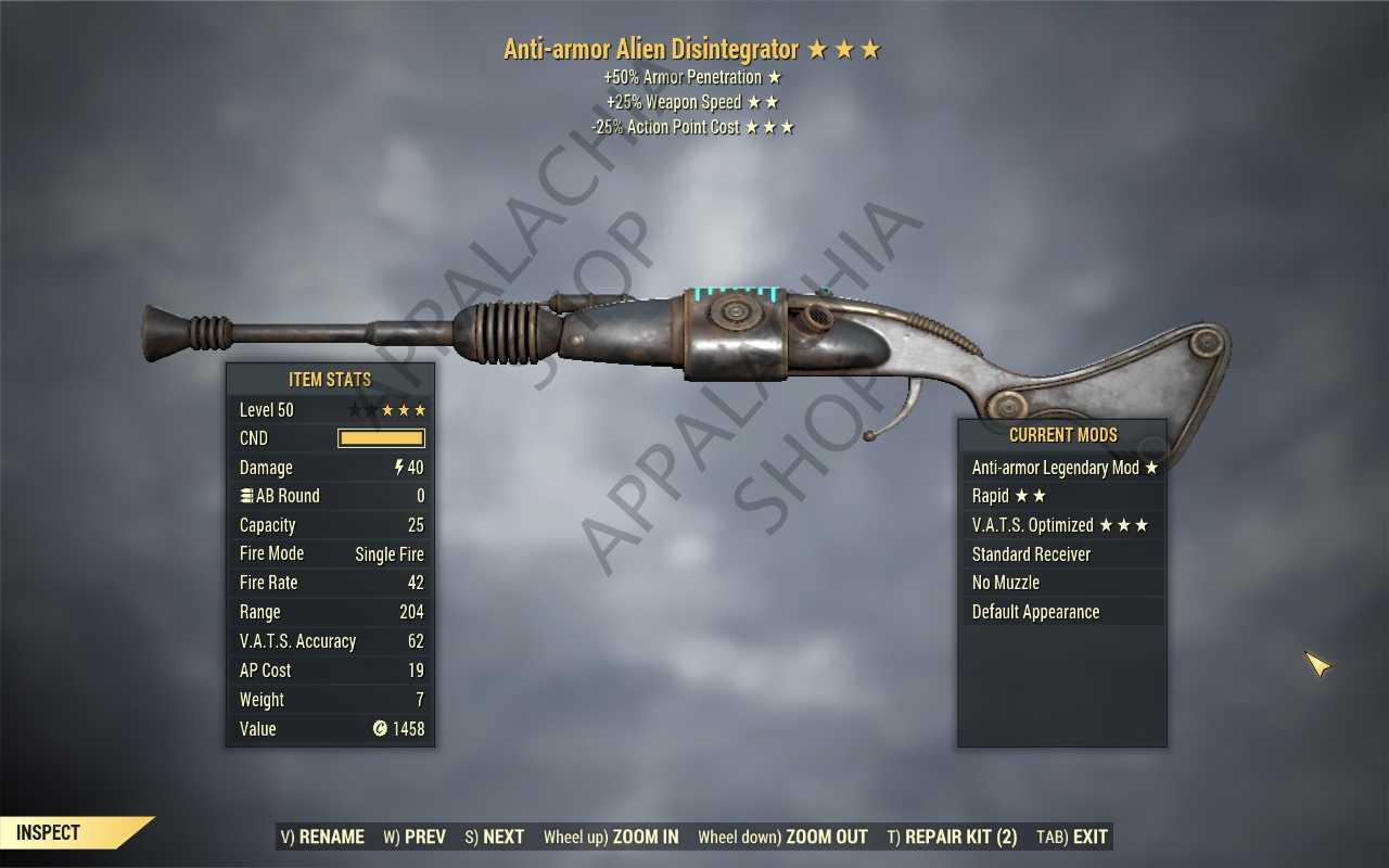 Anti-Armor Alien Disintegrator (25% faster fire rate, 25% less VATS AP cost)