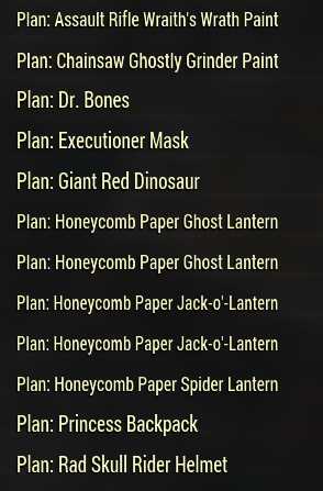 Fast delivery 5-20 min if im online. Plans: Plan: Assault Rifle Wraith's Wrath Paint Plan: Chainsaw Ghostly Grinder Paint Plan: Dr. Bones Plan: Executioner Mask Plan: Giant Red Dinosaur Plan: Honeycomb Paper Ghost Lantern A Plan: Honeycomb Paper Ghost Lantern B Plan: Honeycomb Paper Jack-o'-Lantern A Plan: Honeycomb Paper Jack-o'-Lantern B Plan: Honeycomb Paper Spider Lantern Plan: Princess Backpack Plan: Rad Skull Rider Helmet
