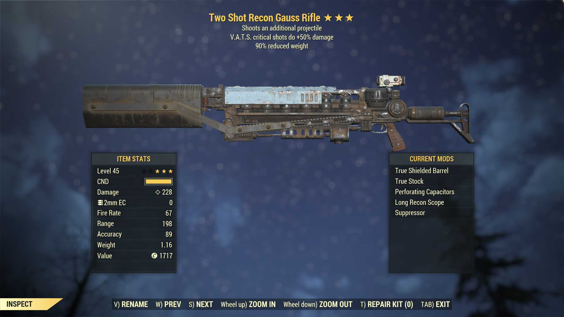 Two Shot Gauss Rifle (+50% critical damage, 90% reduced weight)