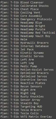 Fast delivery 5-20 min if im online. This bundle include: Plan: T-51b Blood Cleanser Plan: T-51b Calibrated Shocks Plan: T-51b Chest Piece Plan: T-51b Cooling Vent Plan: T-51b Core Assembly Plan: T-51b Emergency Protocols Plan: T-51b Headlamp Blue Plan: T-51b Headlamp Bright Plan: T-51b Headlamp Purple Plan: T-51b Headlamp Red Tactical Plan: T-51b Headlamp Vault Boy Plan: T-51b Helm Plan: T-51b Hydraulic Bracers Plan: T-51b Internal Database Plan: T-51b Jet Pack Plan: T-51b Kinetic Dynamo Plan: T-51b Kinetic Servos Plan: T-51b Left Arm Plan: T-51b Left Leg Plan: T-51b Medic Pump Plan: T-51b Motion-Assist Servos Plan: T-51b Optimized Bracers Plan: T-51b Optimized Servos Plan: T-51b Overdrive Servos Plan: T-51b Reactive Plates Plan: T-51b Recon Sensors Plan: T-51b Right Arm Plan: T-51b Right Leg Plan: T-51b Rusty Knuckles Plan: T-51b Sensor Array Plan: T-51b Stealth Boy Plan: T-51b Targeting HUD Plan: T-51b Tesla Bracers Plan: T-51b Tesla Coils Plan: T-51b VATS Matrix Overlay