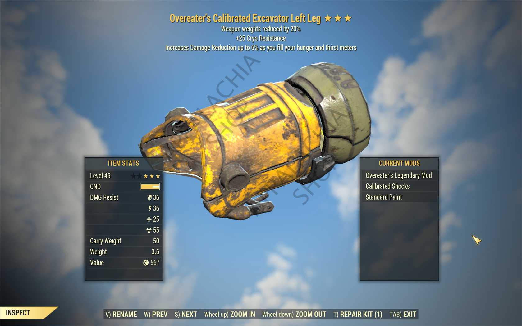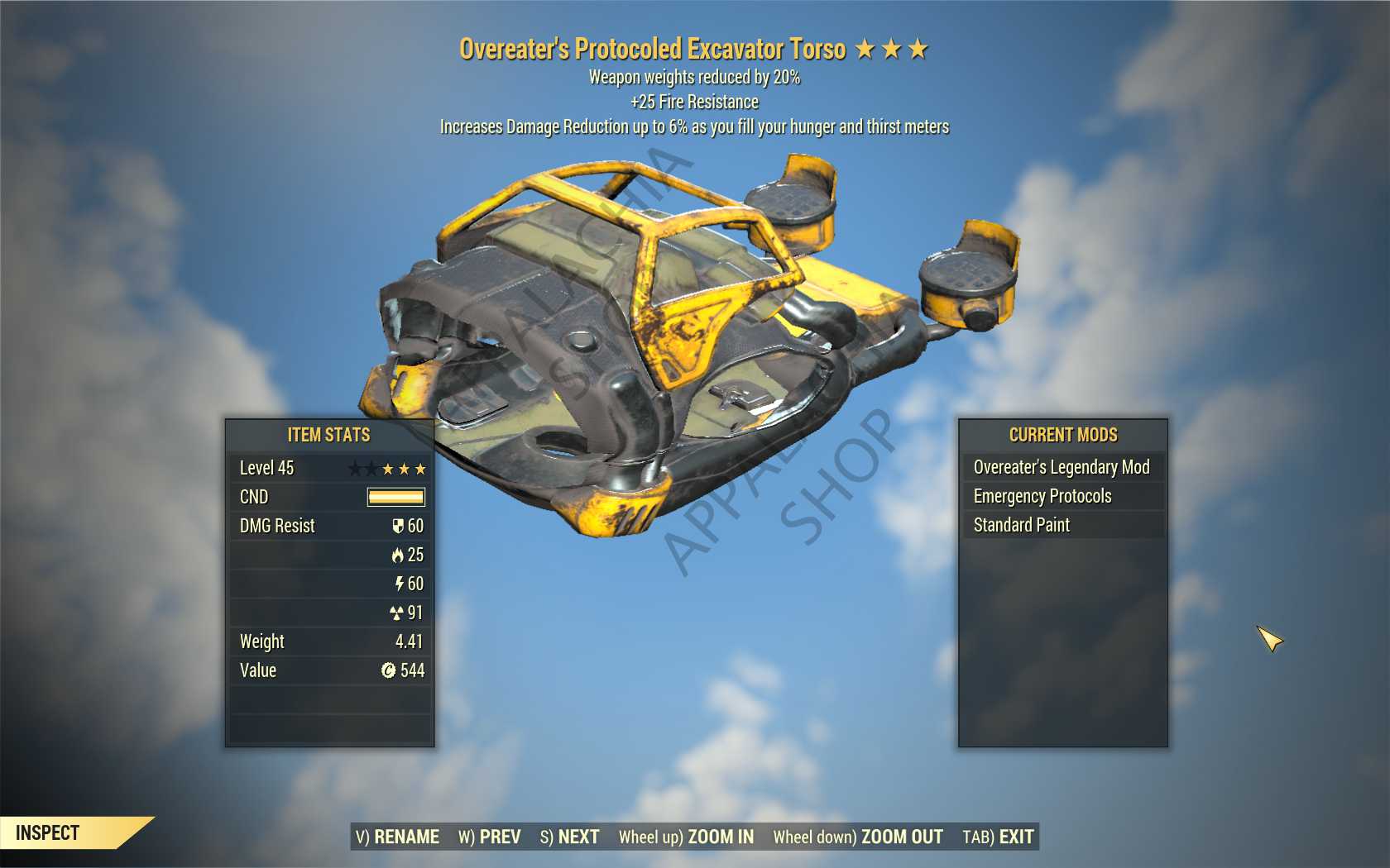 Overeater's Excavator Set (5/5 Weapon weight reduction, 1x AP, +50 cryo,+25 fire, -7% explosion damage) [Legendary Power Armor]