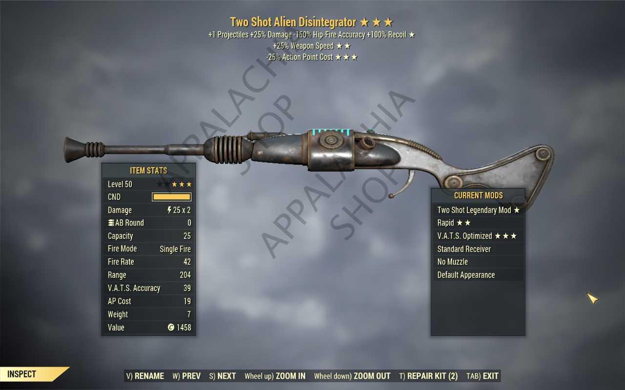 Two Shot Alien Disintegrator (25% faster fire rate, 35% less VATS AP cost)
