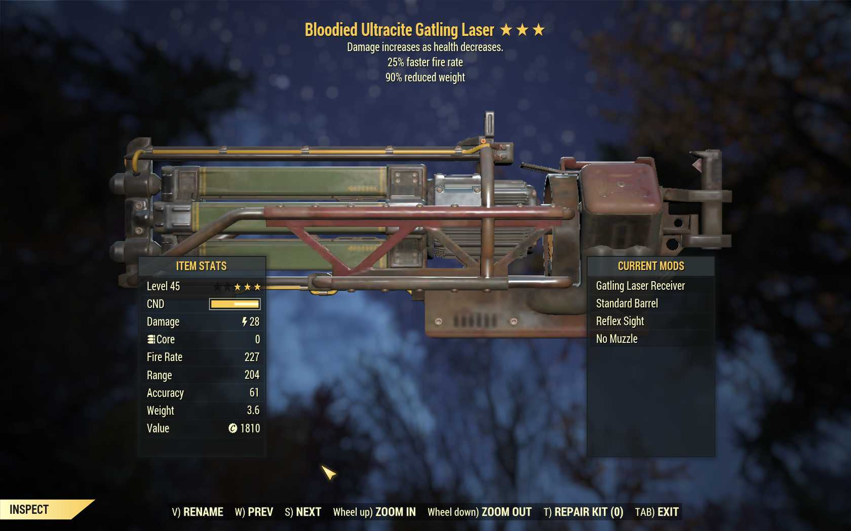 Bloodied Ultracite Gatling Laser (25% faster fire rate, 90% reduced weight)