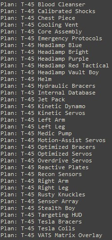 Fast delivery 5-20 min if im online. This bundle include: Plan: T-45 Blood Cleanser Plan: T-45 Calibrated Shocks Plan: T-45 Chest Piece Plan: T-45 Cooling Vent Plan: T-45 Core Assembly Plan: T-45 Emergency Protocols Plan: T-45 Headlamp Blue Plan: T-45 Headlamp Bright Plan: T-45 Headlamp Purple Plan: T-45 Headlamp Red Tactical Plan: T-45 Headlamp Vault Boy Plan: T-45 Helm Plan: T-45 Hydraulic Bracers Plan: T-45 Internal Database Plan: T-45 Jet Pack Plan: T-45 Kinetic Dynamo Plan: T-45 Kinetic Servos Plan: T-45 Left Arm Plan: T-45 Left Leg Plan: T-45 Medic Pump Plan: T-45 Motion-Assist Servos Plan: T-45 Optimized Bracers Plan: T-45 Optimized Servos Plan: T-45 Overdrive Servos Plan: T-45 Reactive Plates Plan: T-45 Recon Sensors Plan: T-45 Right Arm Plan: T-45 Right Leg Plan: T-45 Rusty Knuckles Plan: T-45 Sensor Array Plan: T-45 Stealth Boy Plan: T-45 Targeting HUD Plan: T-45 Tesla Bracers Plan: T-45 Tesla Coils Plan: T-45 VATS Matrix Overlay