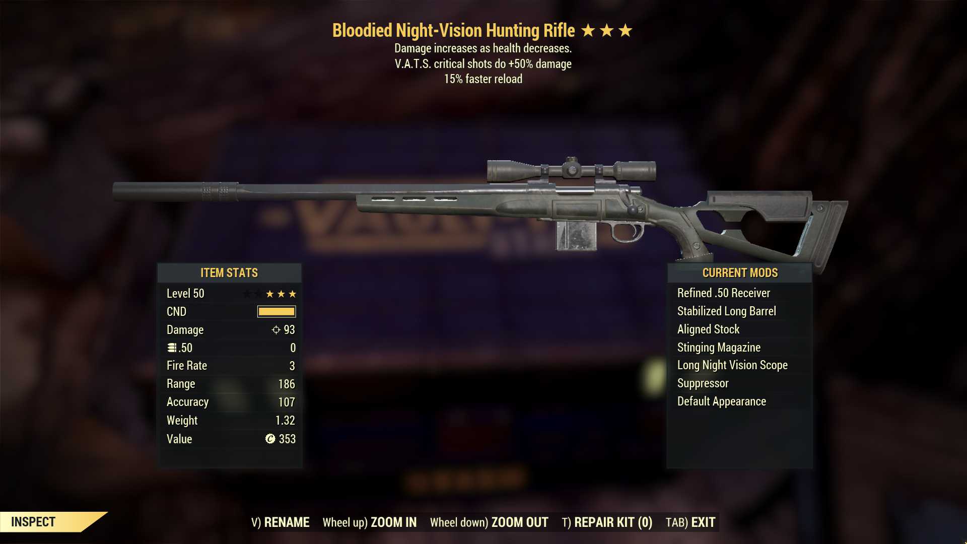 Bloodied Hunting Rifle (+50% critical damage, 15% faster reload)