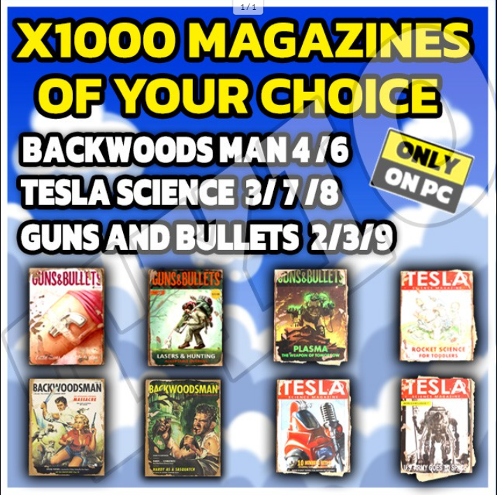 X1000 Magazines of your choice ( BACKWOODS MAN 4 /6 -Tesla Science 3/ 7 /8 -Guns and Bullets 2/3/9)