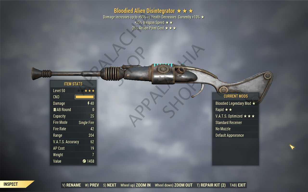 Bloodied Alien Disintegrator (25% faster fire rate, 35% less VATS AP cost)