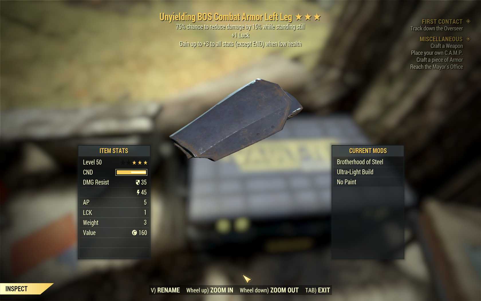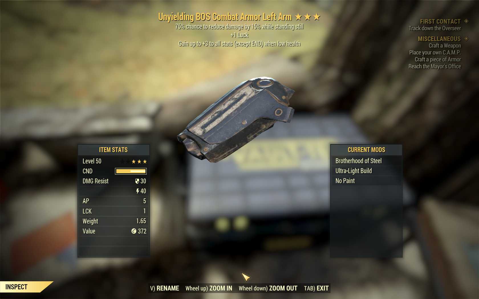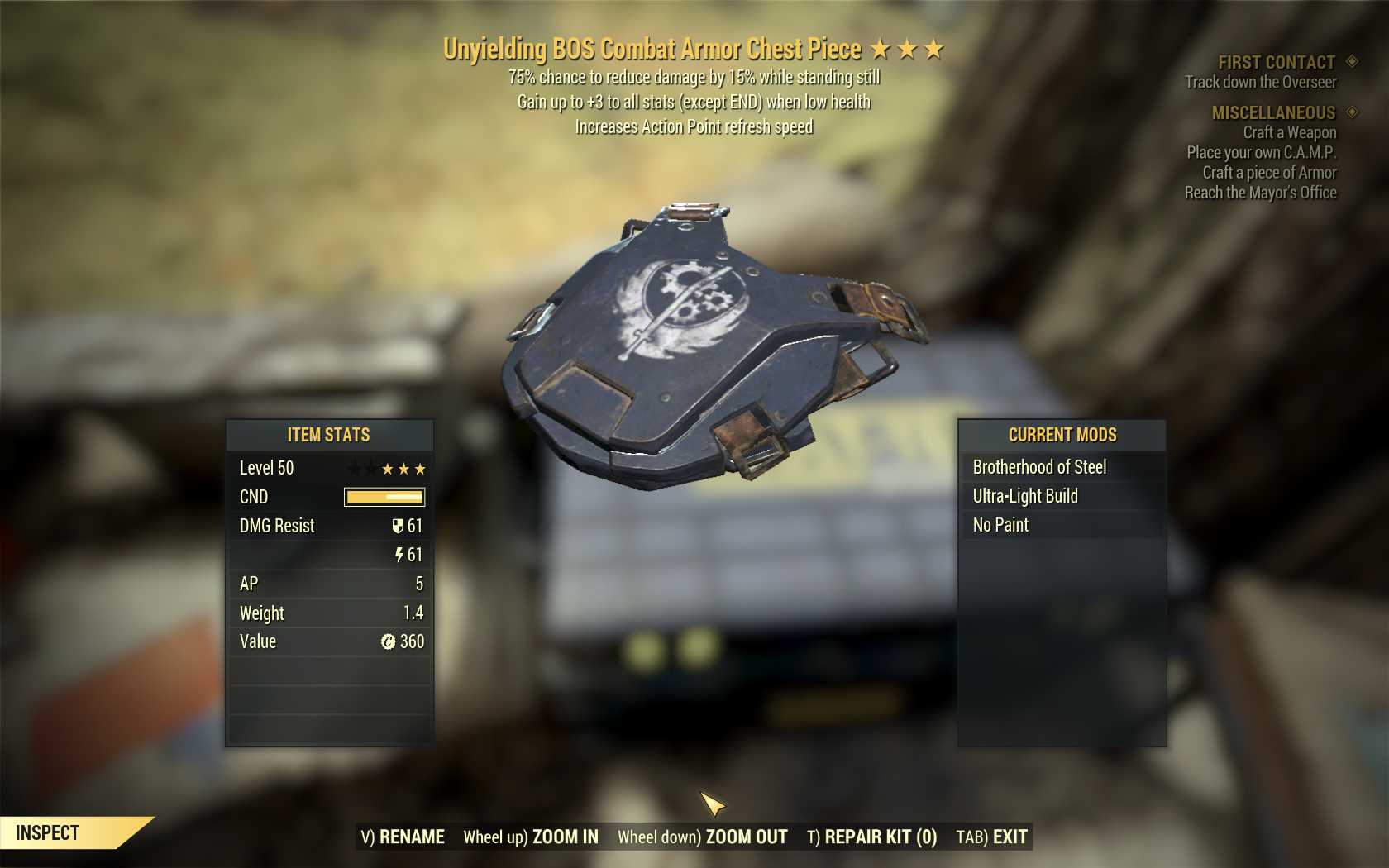 Unyielding Sentinel BOS Combat Armor Set (1 AP, 2 luck, 2 rad)