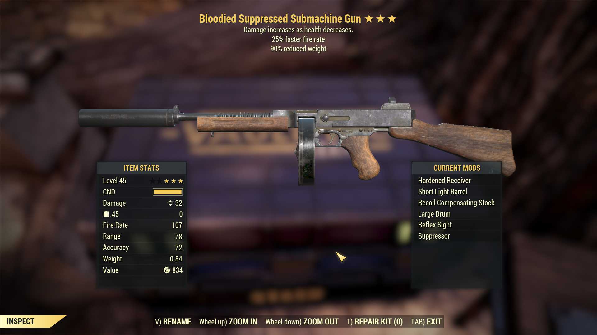 Bloodied Submachine Gun (25% faster fire rate, 90% reduced weight)