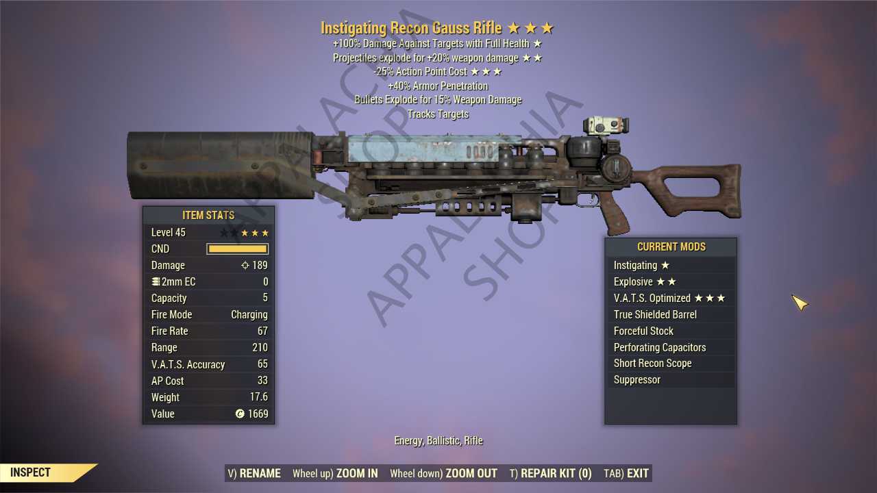 Instigating Explosive Gauss Rifle (35% less VATS AP cost)