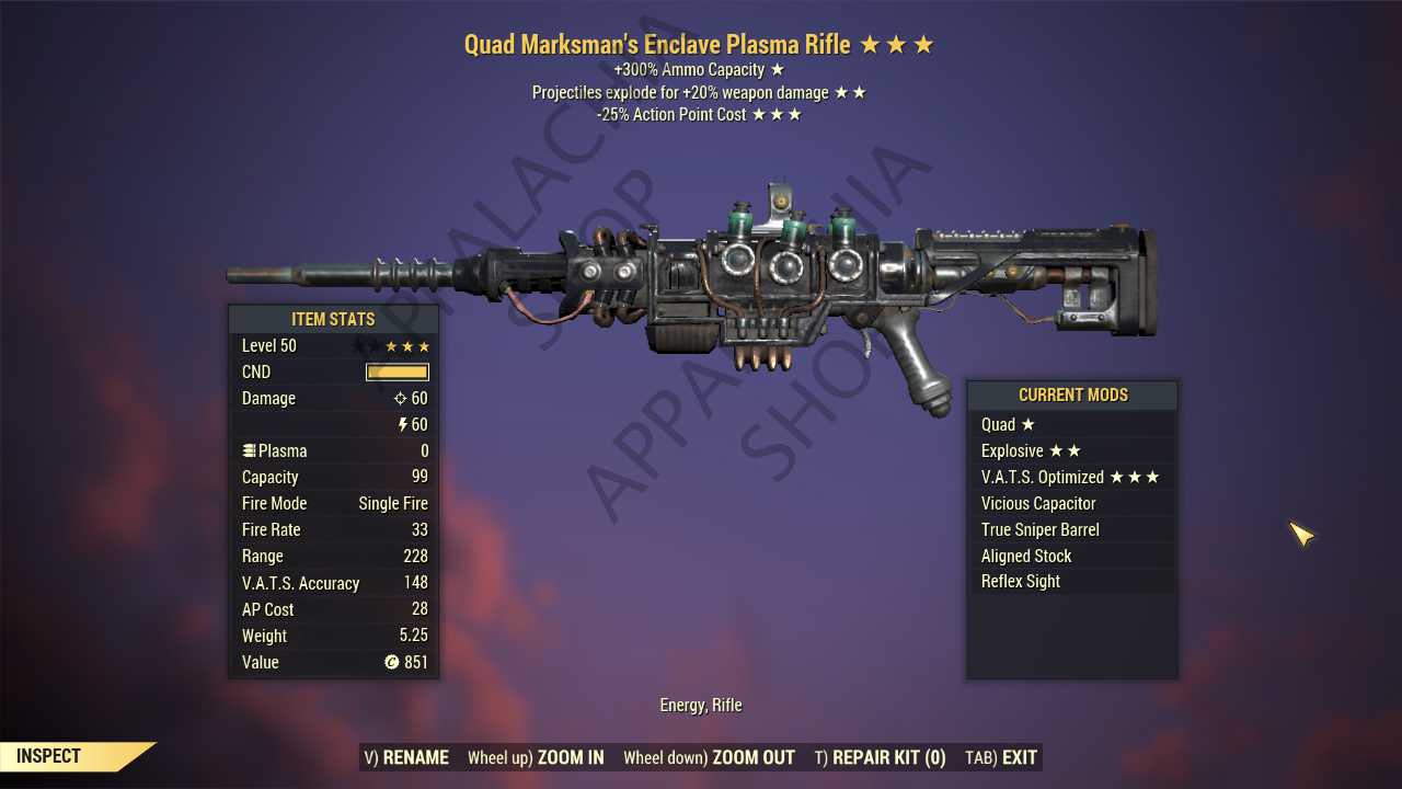 Quad Explosive Enclave Plasma rifle (35% less VATS AP cost)
