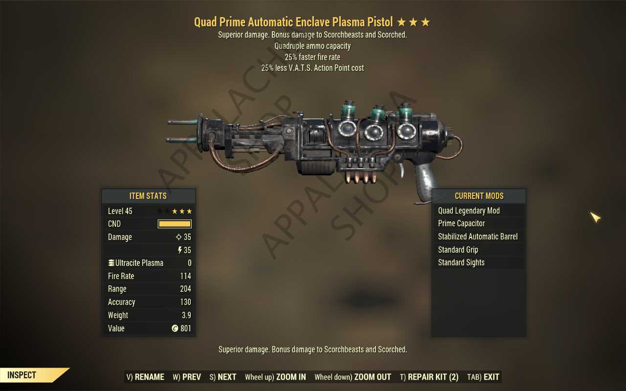 Quad Enclave Plasma rifle (25% faster fire rate, 35% less VATS AP cost)