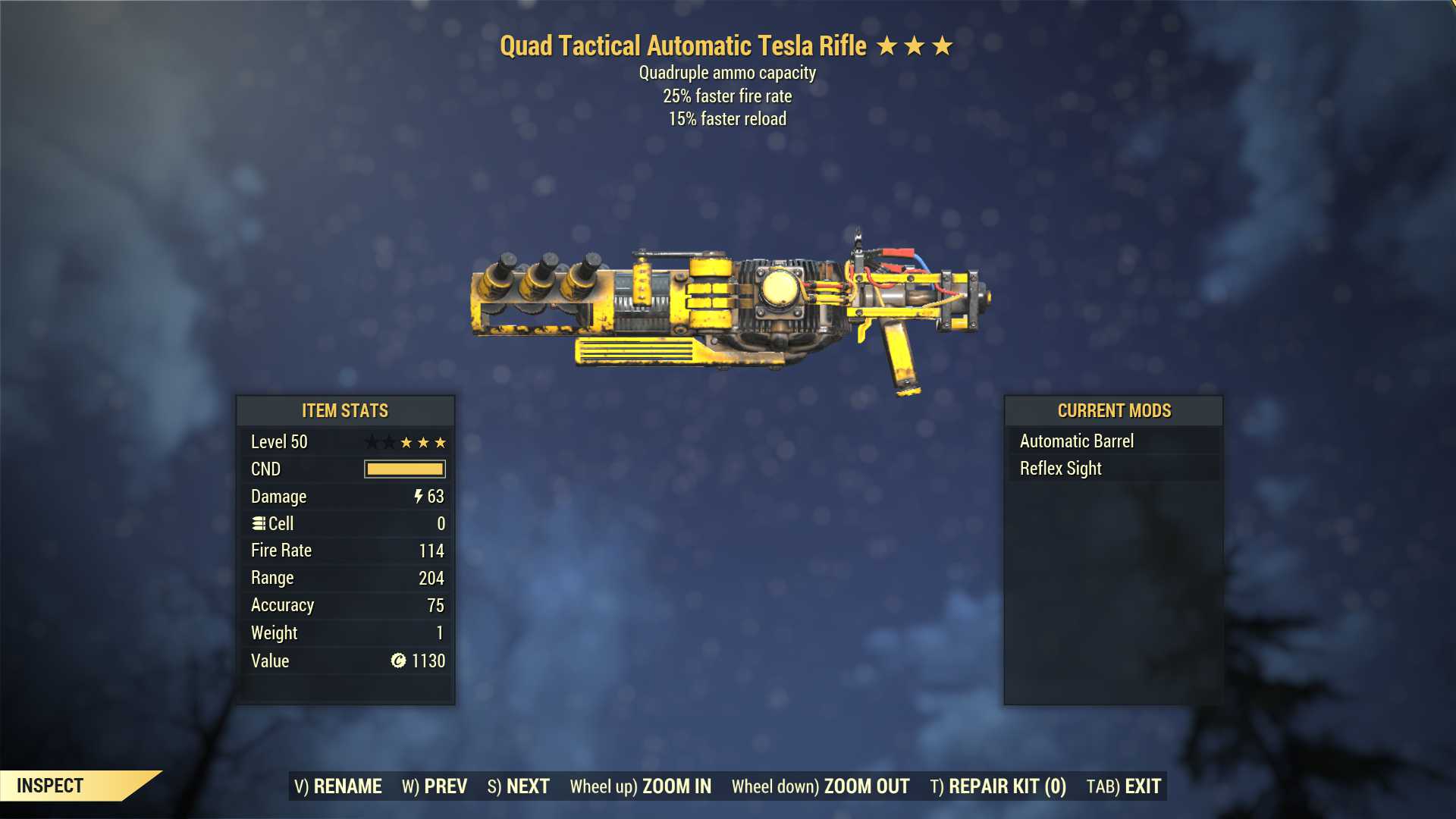 Quad Tesla rifle (25% faster fire rate, 15% faster reload)