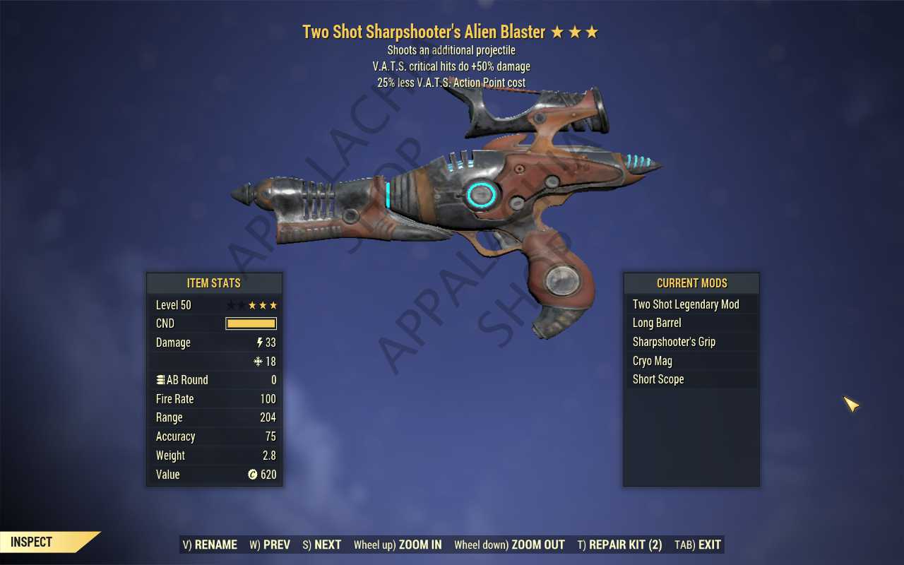 Two Shot Alien Blaster (+50% critical damage, 35% less VATS AP cost)