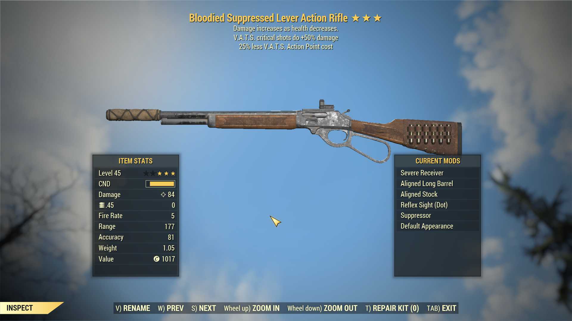Bloodied Lever Action Rifle (+50% critical damage, 35% less VATS AP cost)