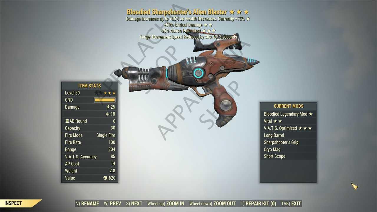 Bloodied Alien Blaster (+50% critical damage, 35% less VATS AP cost)