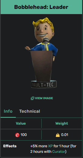 Bobblehead: Leader is a consumable item in Fallout 76. When used, the player character gains +5% more Experience Points for 1 hour (for 2 hours with Curator).