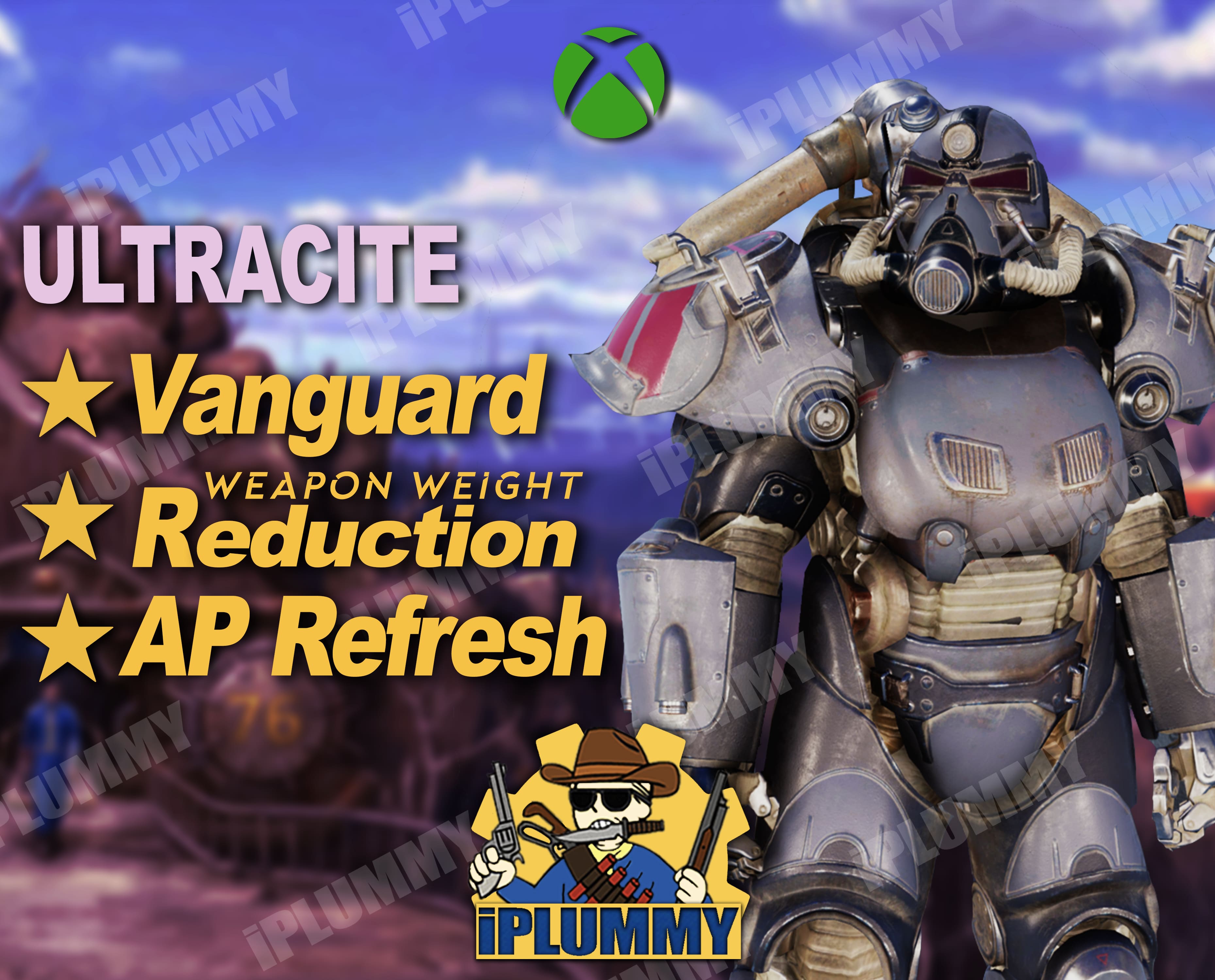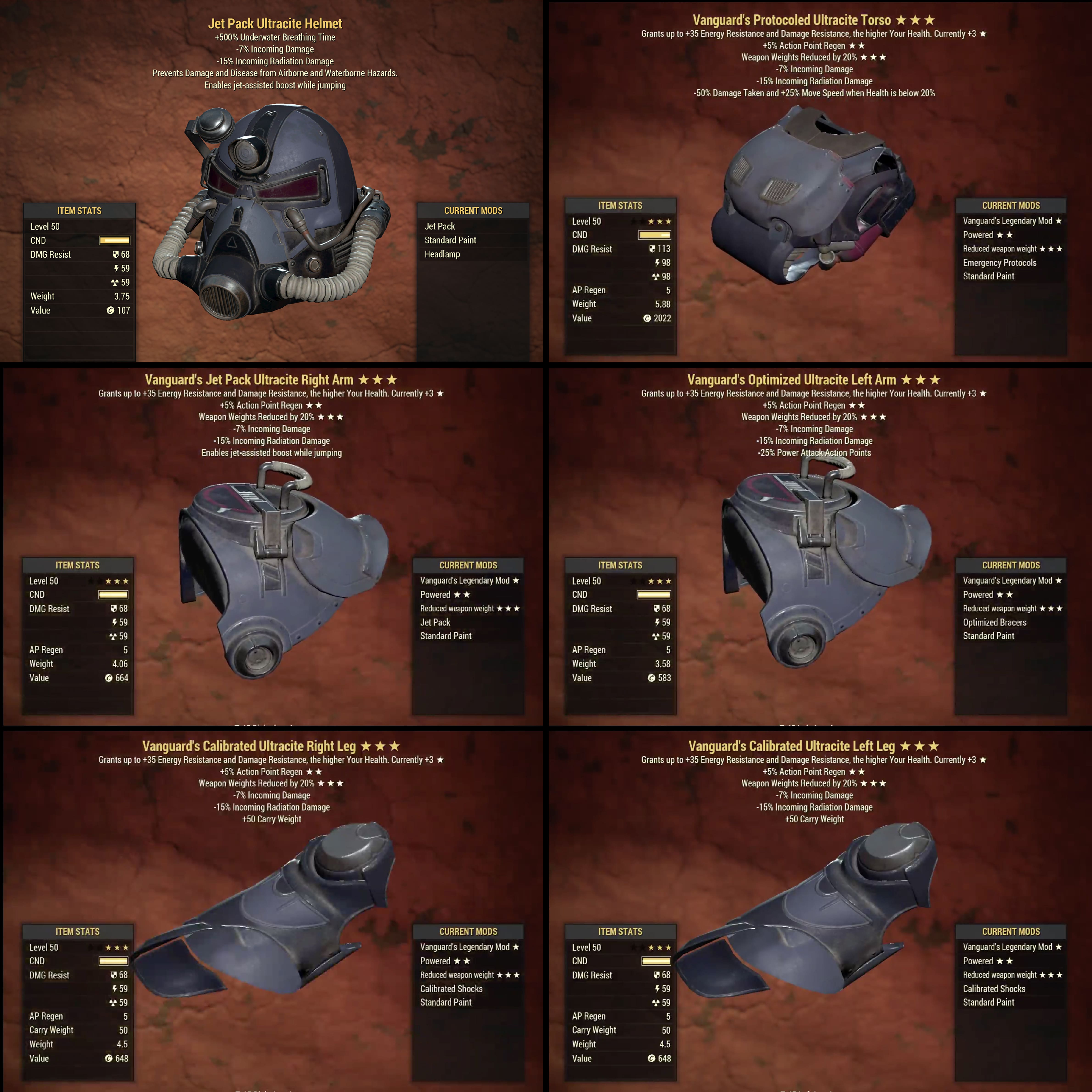 This listing includes a full set of legendary Ultracite Power Armor (max level), with each piece of armor having the following effect: