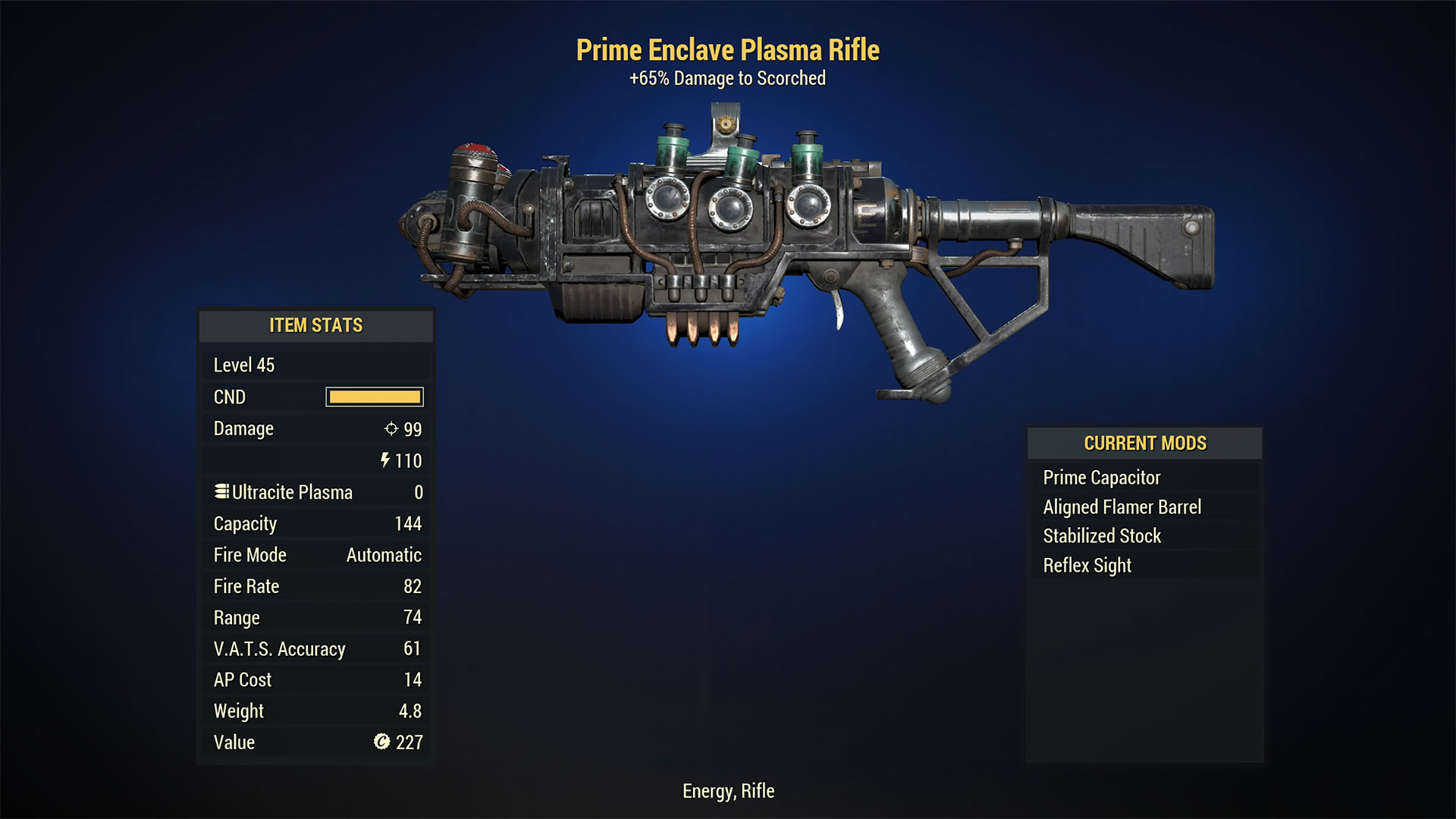 Enclave Plasma Flamer with Automatic Flamer Barrel and Reflex sight + 4 Legendary Mods Of Your Choice