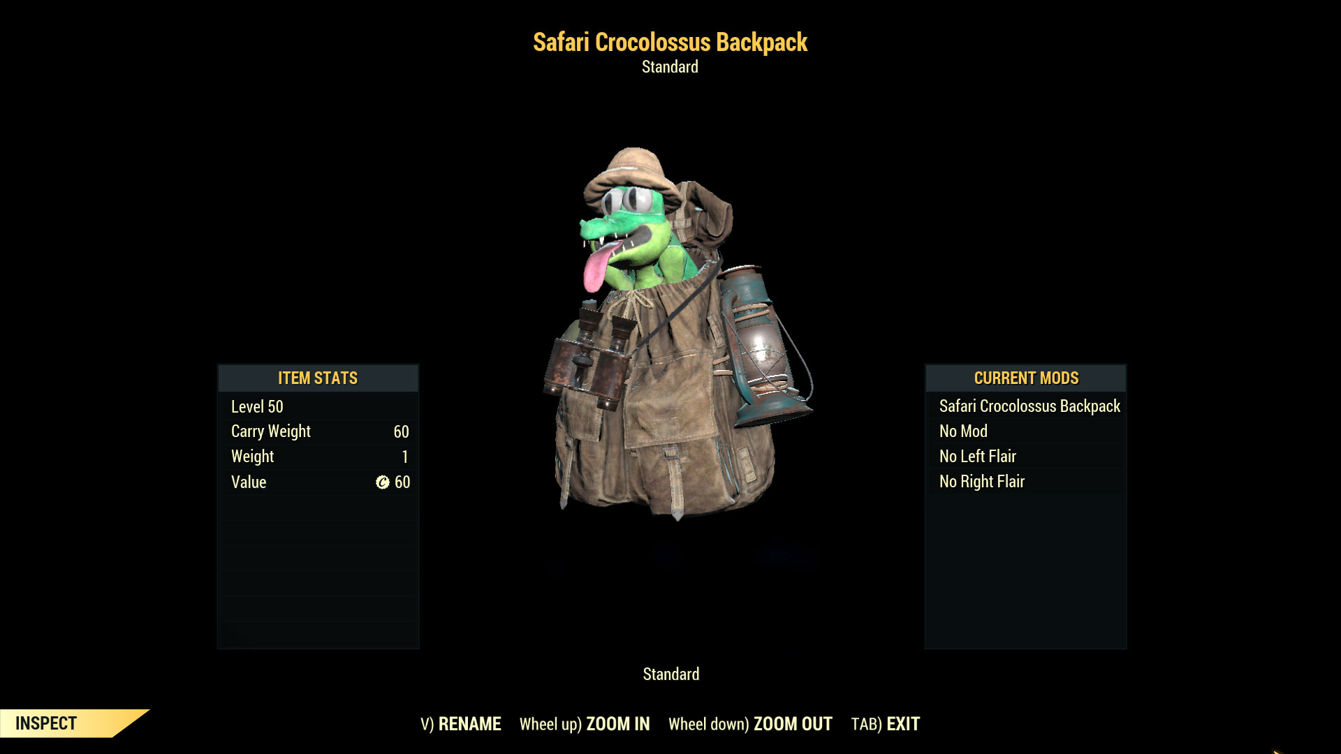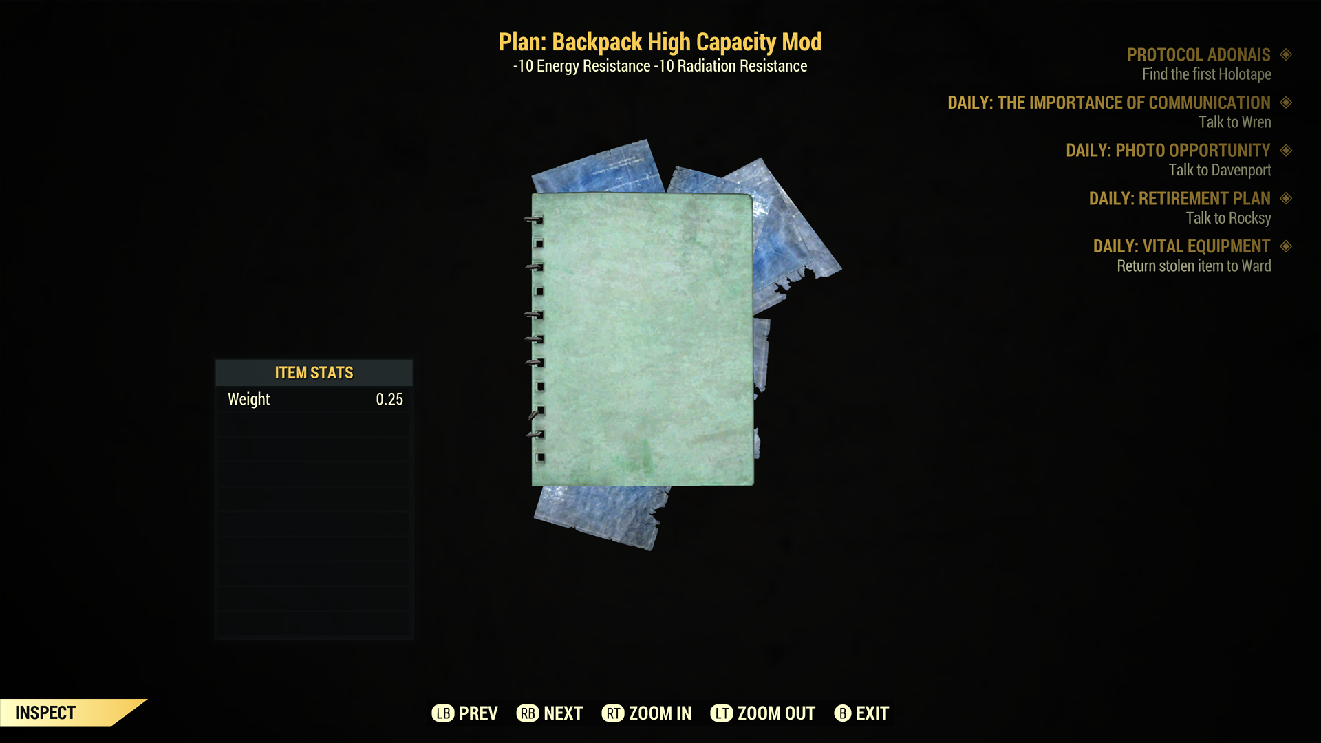 Plan: Backpack High Capacity Mod (gets additional +120 carry weight at lvl 50)