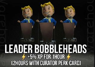 Bobblehead: Leader is a consumable item in Fallout 76. When used, the player character gains +5% more Experience Points for 1 hour (for 2 hours with Curator).