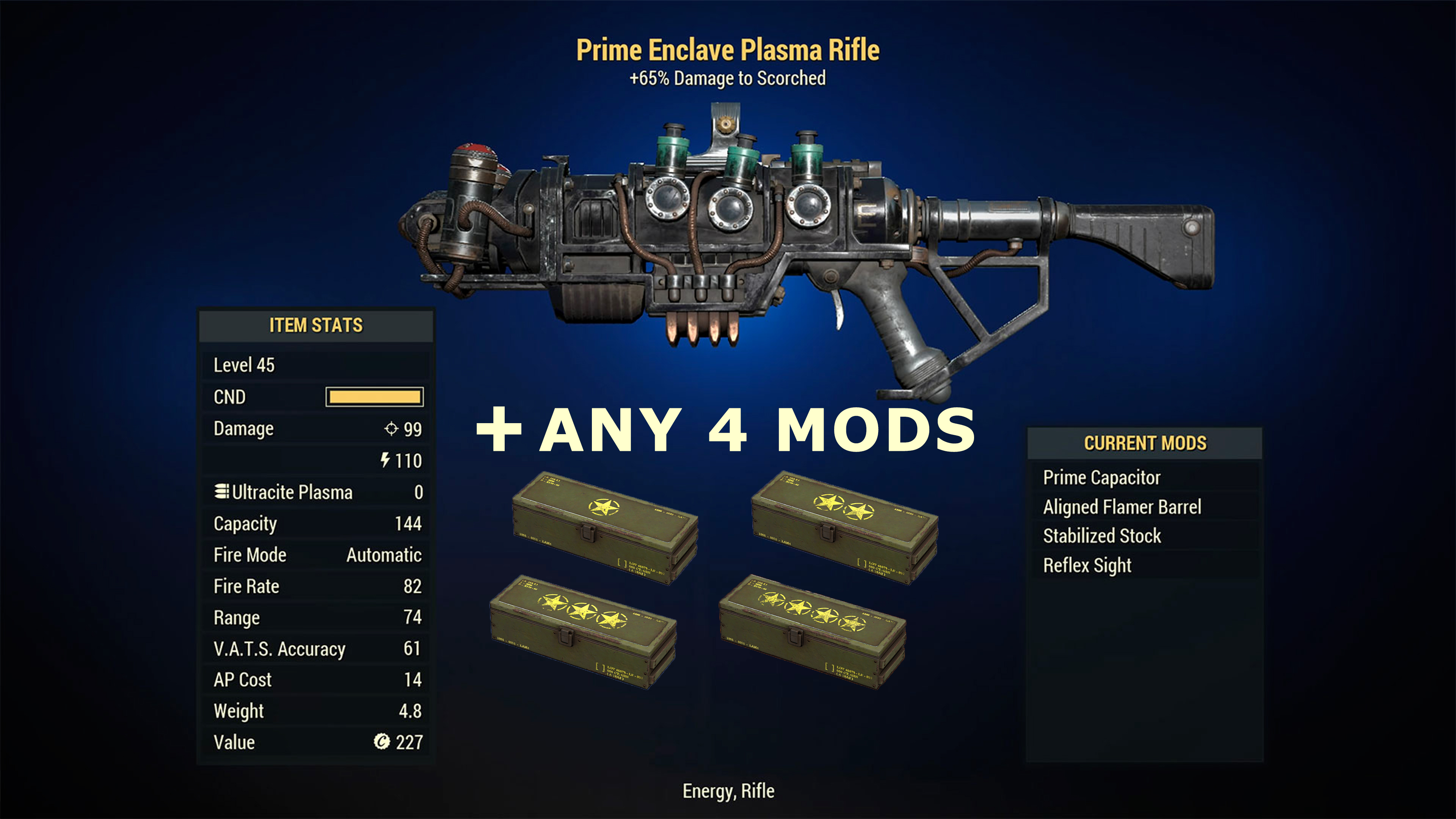 Enclave Plasma Flamer with Automatic Flamer Barrel and Reflex sight + 4 Legendary Mods Of Your Choice