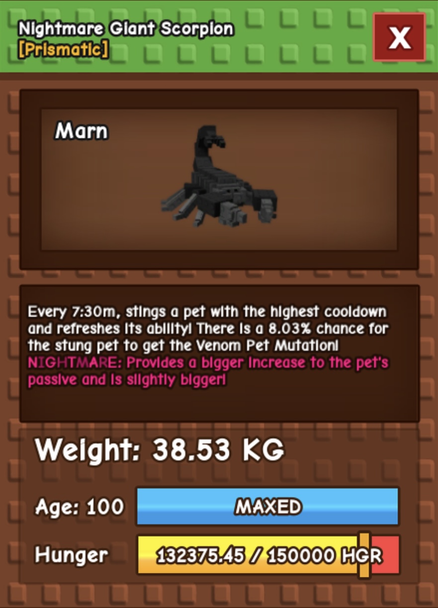 38.53kg weight, 7:30 minutes with 8.03% chance or venom mutation.