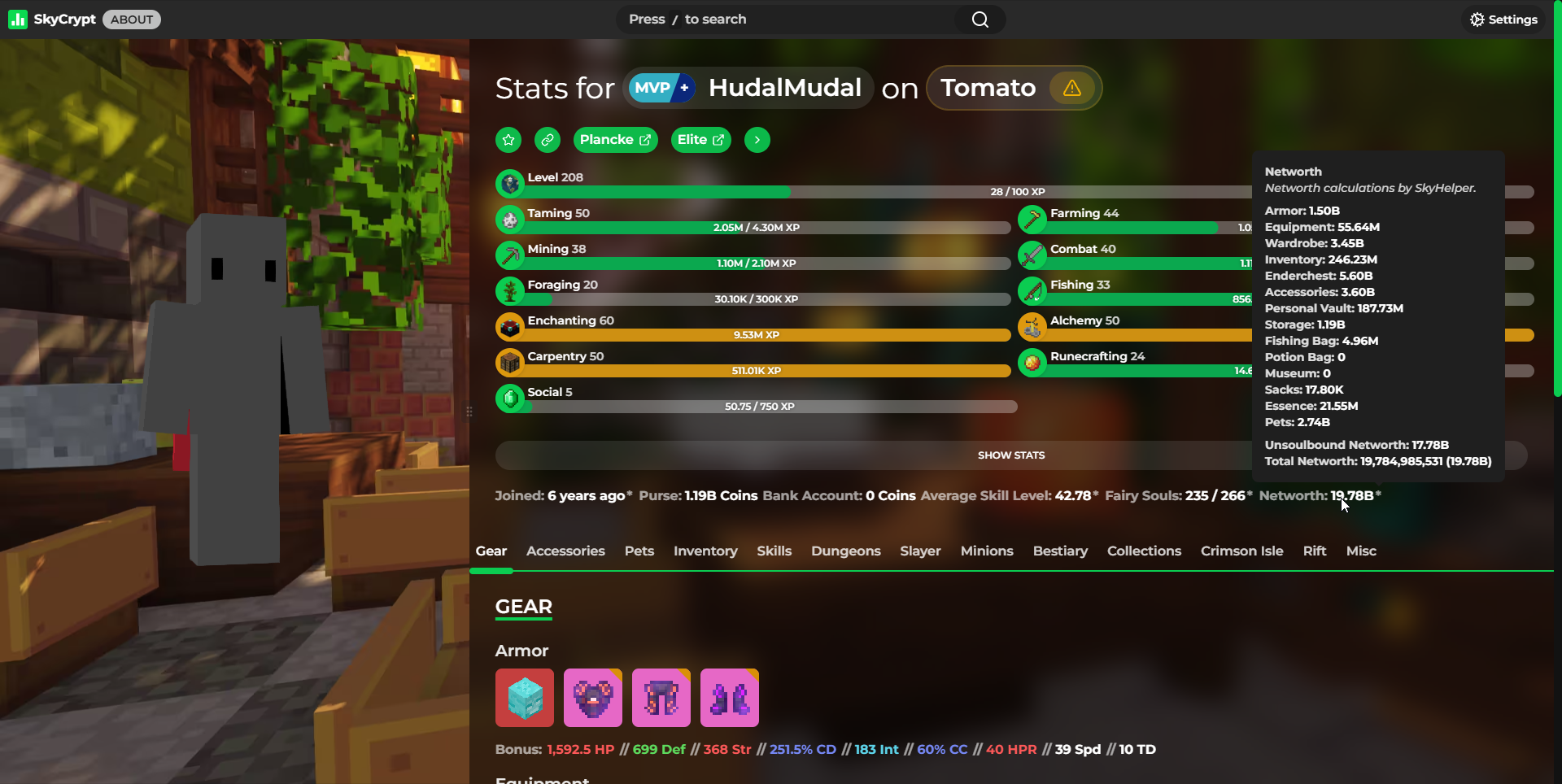 Detailed statistics - https://sky.shiiyu.moe/stats/HudalMudal/Tomato#Gear ⚡