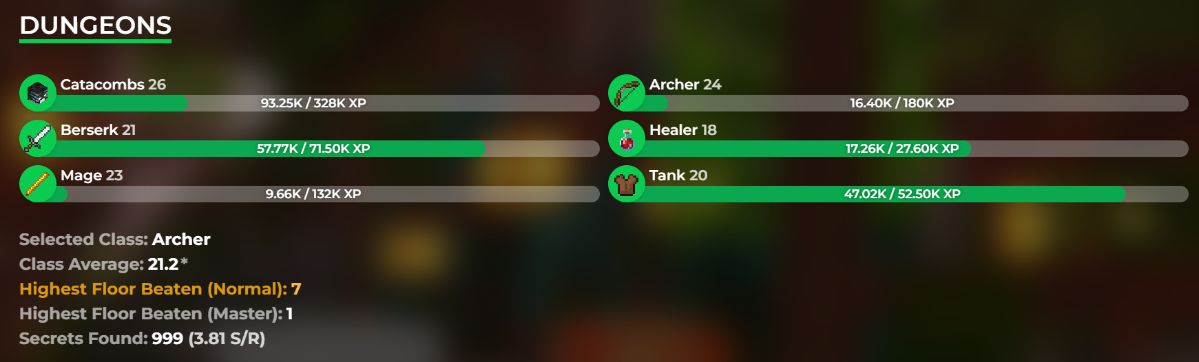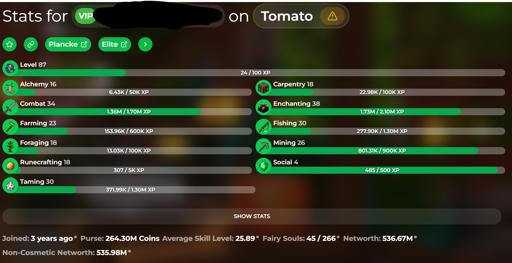 VIP / Skill average 26 ( Combat 34 /Farming 23 ) / NW 535M / Hypixel lvl 87 / Cata 26