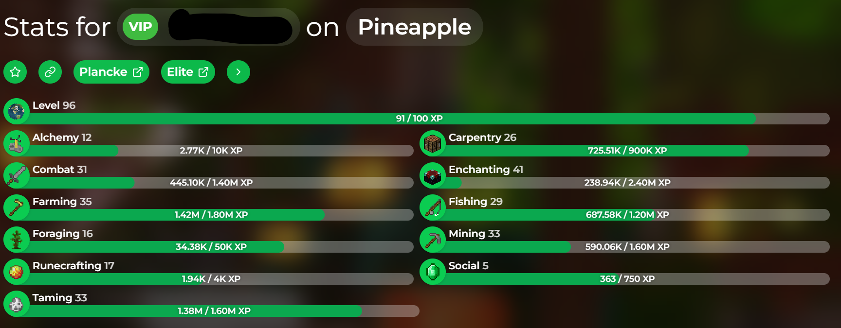 VIP / Skill average 28 ( Combat 31 /Farming 35) / NW 1.3B / Hypixel lvl 96 / Cata 27
