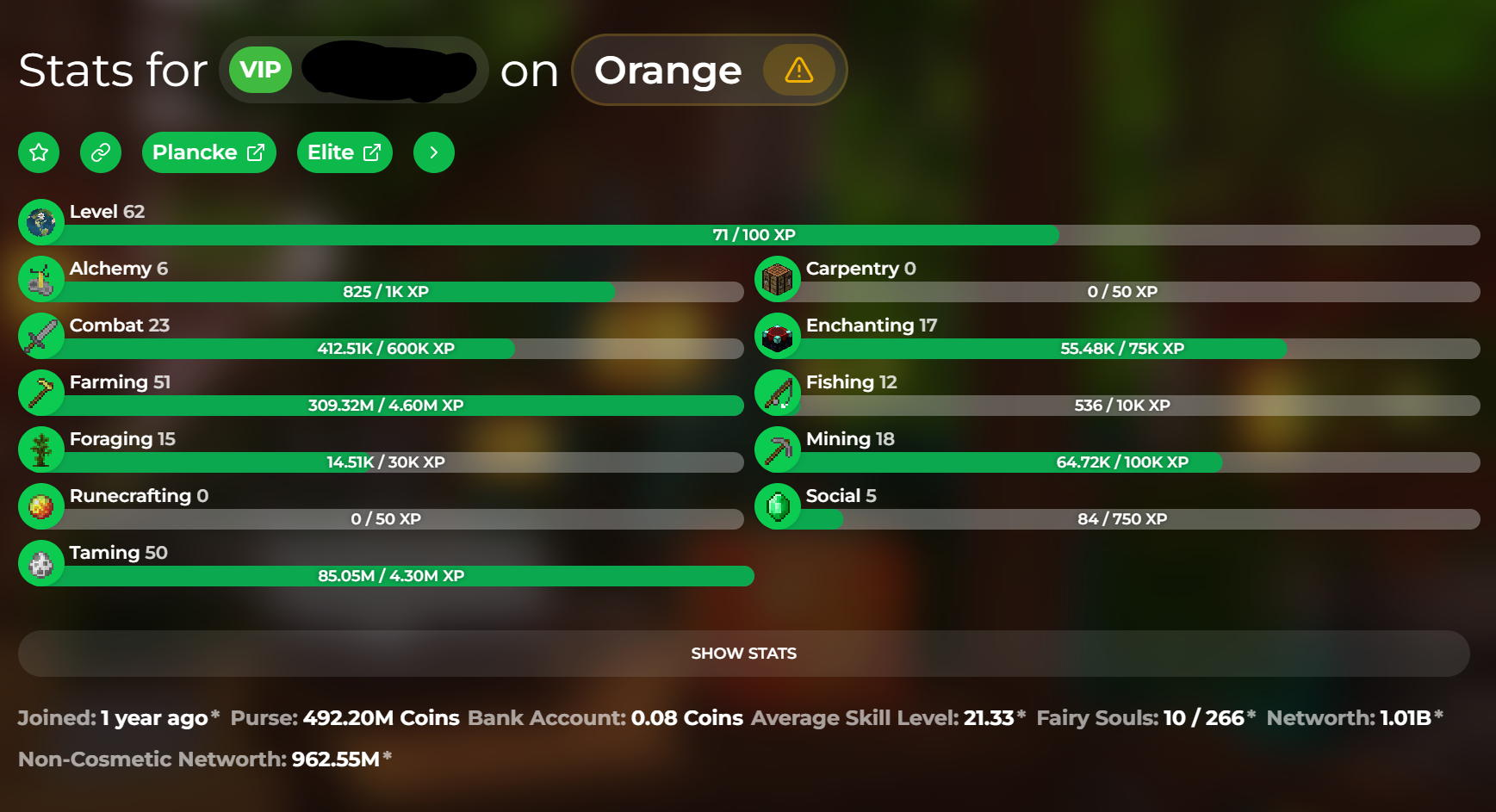 Minecraft account / Skill average 21 ( Combat 23 /Farming 51 ) / NW 1.01B / Hypixel lvl 62