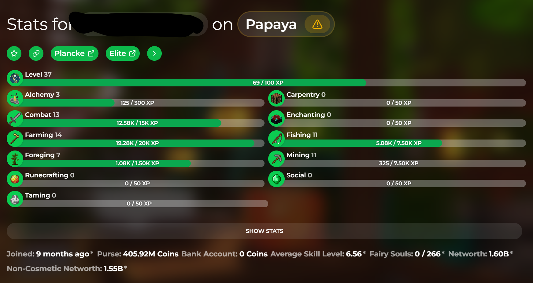 Minecraft account / Skill average 7 ( Combat 13 /Farming 14) / NW 1.6B / Hypixel lvl 37 / Cata 27